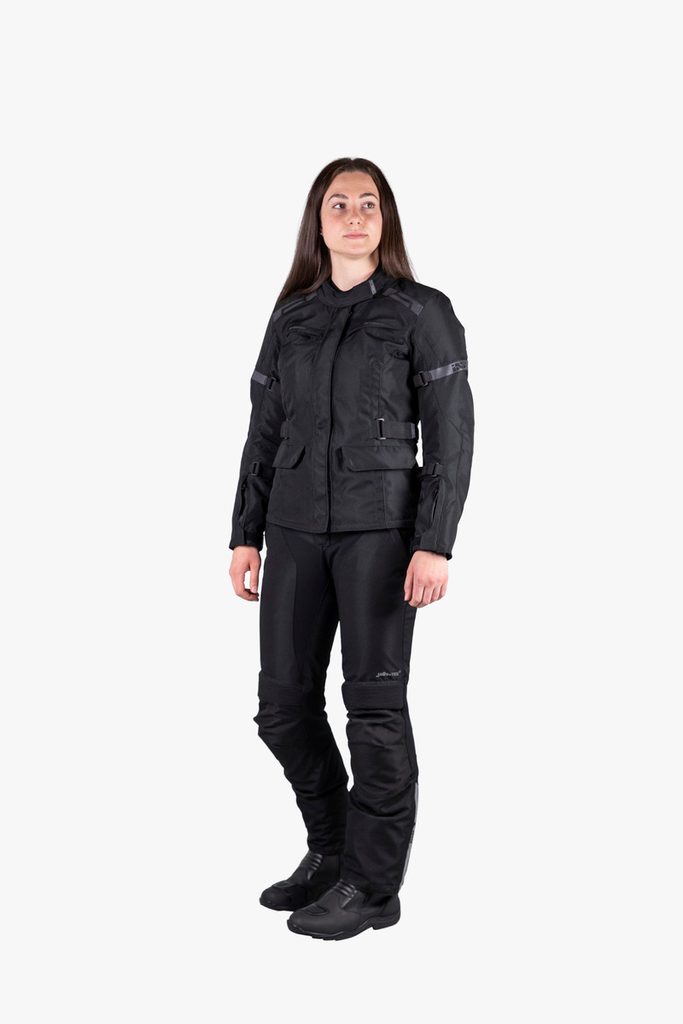 Dámské voděodolné kalhoty vyrobené z odolného polyesteru 600D. Díky celoobvodovému zipu standardní velikosti a univerzální černé barvě můžete kalhoty nosit se sportovními i cestovními iXS bundami. Kalhoty jsou střižené na dámskou postavu.