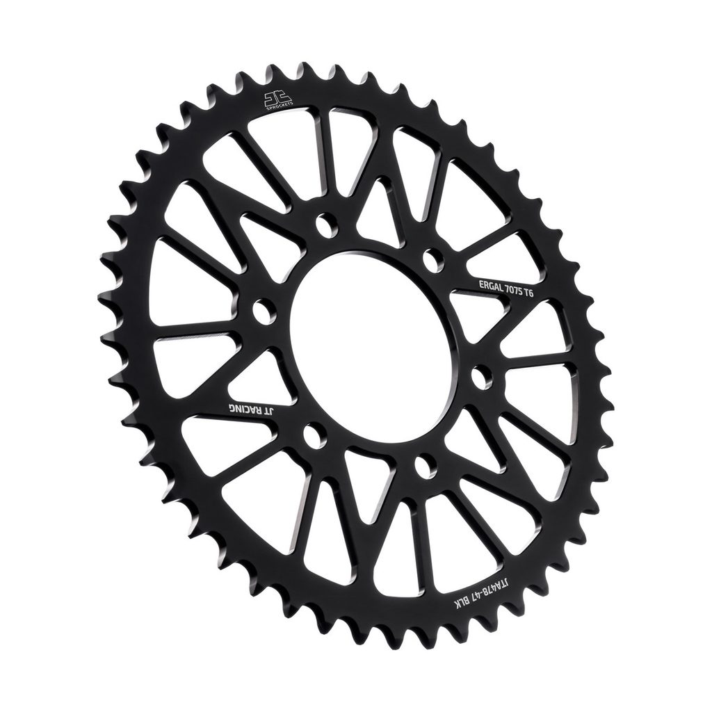 JT používá výhradně ty nejkvalitnější materiály. Pro závodní lehké rozety je to hliníková slitina letecké kvality 7075-T6, pro přední pastorky extrémně pevná slitina SCM420 (chrom-molybdenová ocel) a pro zadní ocelové rozety jako jediný výrobce používá ultra odolnou uhlíkovou ocel C49.