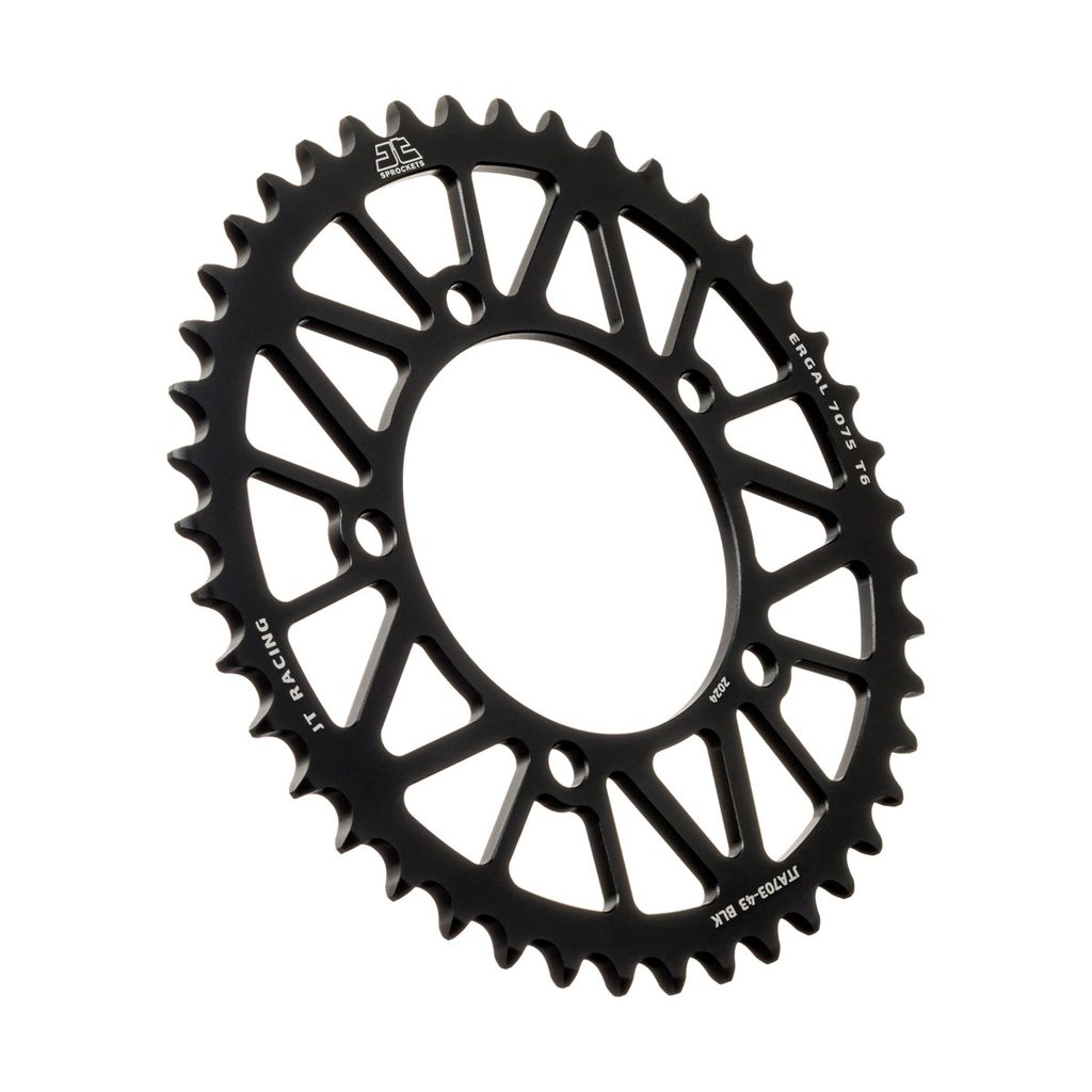 JT používá výhradně ty nejkvalitnější materiály. Pro závodní lehké rozety je to hliníková slitina letecké kvality 7075-T6, pro přední pastorky extrémně pevná slitina SCM420 (chrom-molybdenová ocel) a pro zadní ocelové rozety jako jediný výrobce používá ultra odolnou uhlíkovou ocel C49.