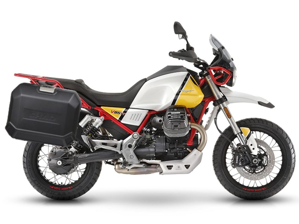 Kompletní sada bočních černých hliníkových kufrů SHAD TERRA BLACK 36L/47L, včetně montážní sady SHAD MOTO GUZZI V 85 TT