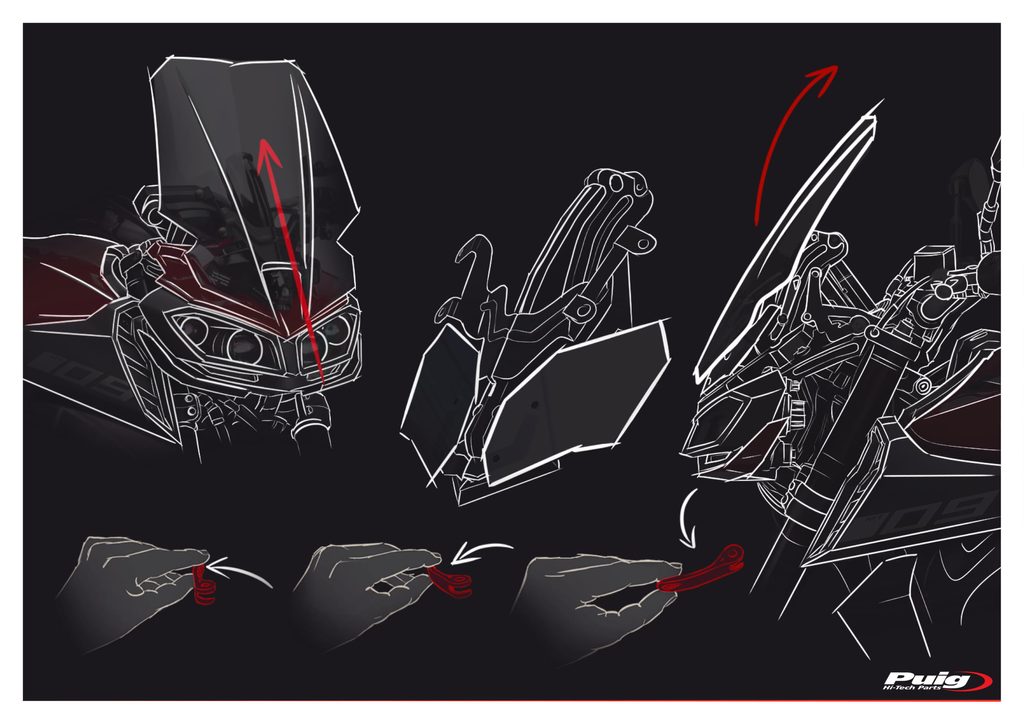 Manuální regulační systém plexiskla pro YAMAHA MT-09, který umožní posunout plexisklo až o 110 milimetrů. Dodává se s vysoce kvalitními akrylovými bočními deflektory, které zlepší aerodynamiku, ale neuškodí vzhledu MT-09. Podpěry MEM jsou vyrobeny z 2mm široké oceli s antikorozní povrchovou úpravou, což neovlivňuje jejich lehkost a design. V nejvyšší poloze činí aerodynamická ochrana 72 % (při použití plexiskla Puig Touring). Jeho montáž je jednoduchá a hotová do 15 minut.