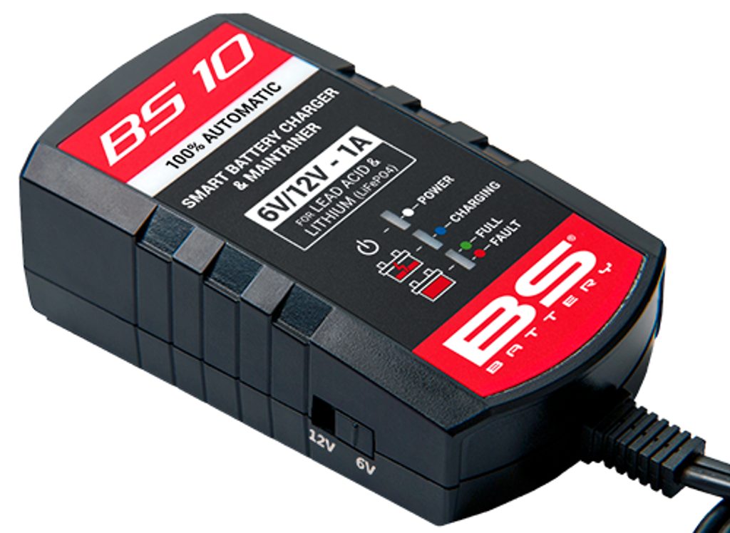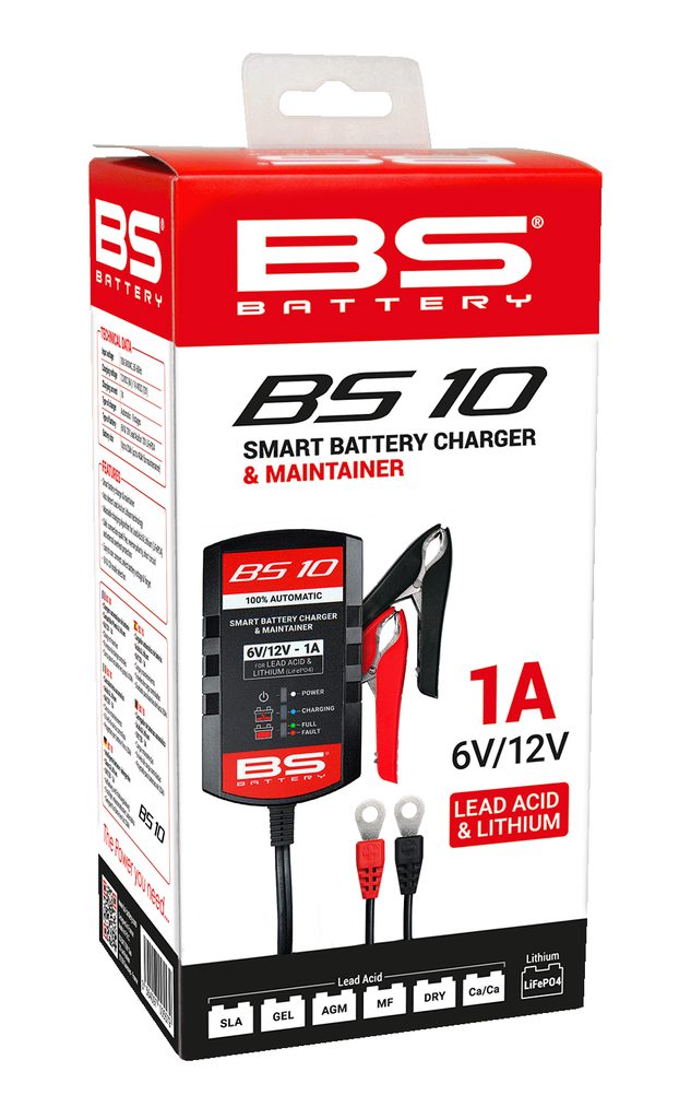 BS Charger BS 10 je automatická chytrá nabíječka a udržovací zařízení pro olověné a lithiové baterie s napětím 6 V / 12 V a nabíjecím proudem 1 A. Díky kompaktnímu a lehkému provedení je ideální na cesty a je vhodná pro akumulátory s kapacitou až 20 Ah.