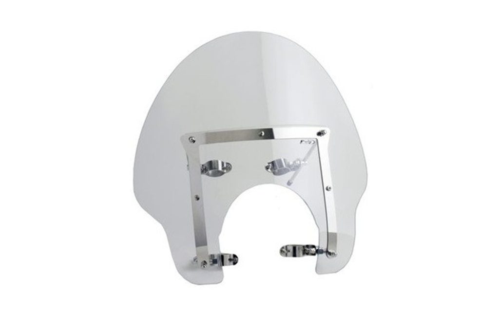 Je vyroben z akrylu o tloušťce 4 mm a nerezové provedení zaručuje kvalitu a odolnost tohoto dílu, zatímco chromované úchyty dodávají finální custom vzhled. Je upevněn na motocyklu pomocí 4 kotevních bodů na řidítkách, čímž se snižuje pohyb při jízdě.