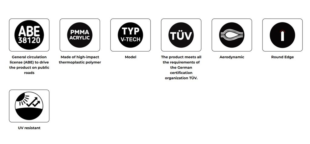 Je vyroben z 4mm akrylu s vysokou odolností proti nárazům a byl pečlivě navržen, vyvinut a testován v aerodynamickém tunelu, aby bylo dosaženo maximální účinnosti a pevnosti při nepříznivém počasí a silných poryvech větru, což zaručuje vysokou míru aerodynamické odolnosti.