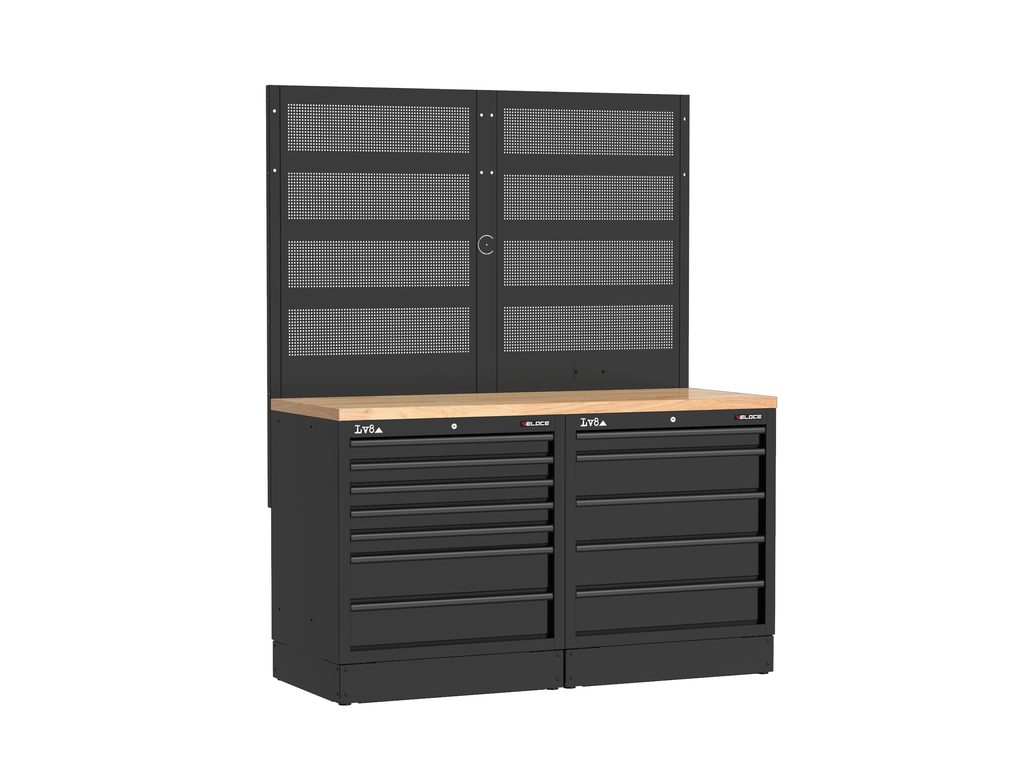 Pracovní stůl délky 1600 mm s dvěma skříňkami – 7 a 5 zásuvek se zámkem. Robustní a praktický stůl s masivní dřevěnou pracovní deskou, dvojitým perforovaným panelem na nářadí a připraveností pro připojení elektrické zásuvky. K dispozici také v provedení s nerezovou nebo melaminovou deskou.