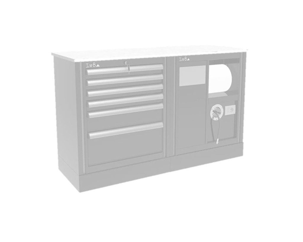 Závodní pracovní stůl složený ze dvou skříněk na kolečkách: jedna skříňka se 6 zásuvkami a druhá servisní část vybavená košem na odpadky, držákem na papírové utěrky, přípravou pro elektrickou zásuvku a naviják na hadici. Snadná manipulace a rychlá demontáž výrazně usnadňují nakládku a vykládku mezi dodávkou a servisní zónou.