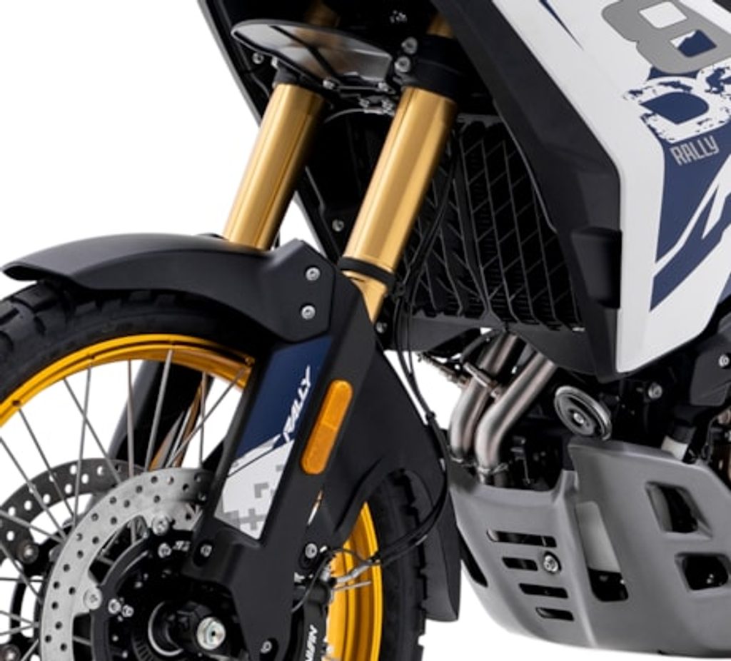 Vpředu najdeš jednadvacítku, vzadu osmnáctku – prostě offroad klasika. Kola jsou samozřejmě drátový a bezdušový. Na ráfkách dostaneš gumy Pirelli Scorpion Rally STR, který si hravě poraděj jak s asfaltem, tak s terénem.