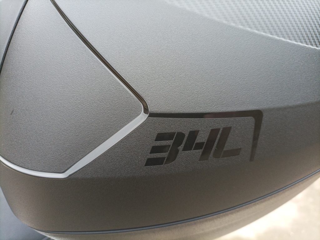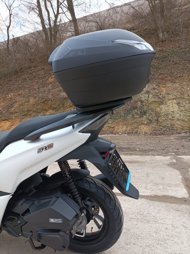 Pod sedlo hodíš běžnej nákup, případně jetku nebo menší integrálku. A kdybys vyrazil na větší nákup, už v základu dostaneš zadní hliníkovej nosič s 34litrovým kufrem. Drobnosti si schováš do zamykatelný přihrádky s USB, kterou mám v předním štítu.